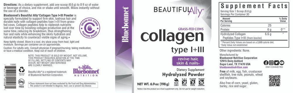 Bluebonnets Beautiful Ally Collagen Powder is specially formulated with collagen peptides types I + III, key structural components for lustrous hair, firm skin, and durable nails. During the aging process, collagen levels deplete in the body, resulting in connective tissue degradation, which manifests as wrinkles, thinning cartilage, and brittle hair. Collagen peptides help replenish the nutrients lost over time, boosting collagen production while reducing its breakdown, thereby enhancing the skins hydration and natural elasticity while counteracting visible signs of aging. This neutral-tasting powder can be added to any beverage without affecting its flavor profile and is hydrolyzed for maximum assimilation and absorption.