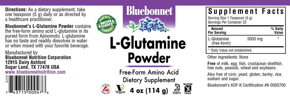 Bluebonnet, L-Glutamine Powder, Free-Form Amino Acid, Dietary Supplement, AJIPURE Amino Acids, NON GMO, Vegan, Kosher, Gluten Free, 4 0z (114g)