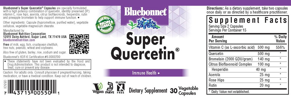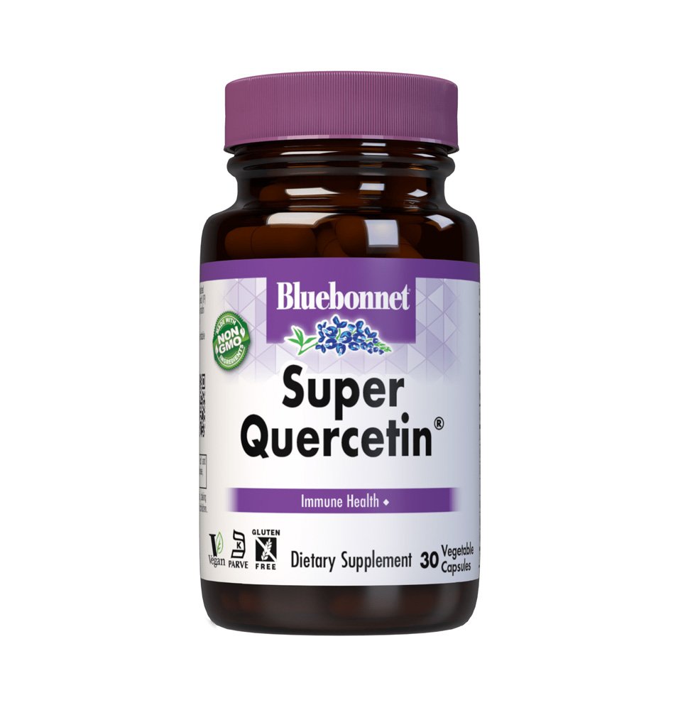 Bluebonnet Super Quercetin capsules are specially formulated with a high potency combination of Quercetin, identity-preserved (IP) vitamin C, rose hips, acerola, citrus bioflavonoids, hesperidin, rutin, and pineapple bromelain. Available in easy-to-swallow vegetable capsules for maximum assimilation and absorption.